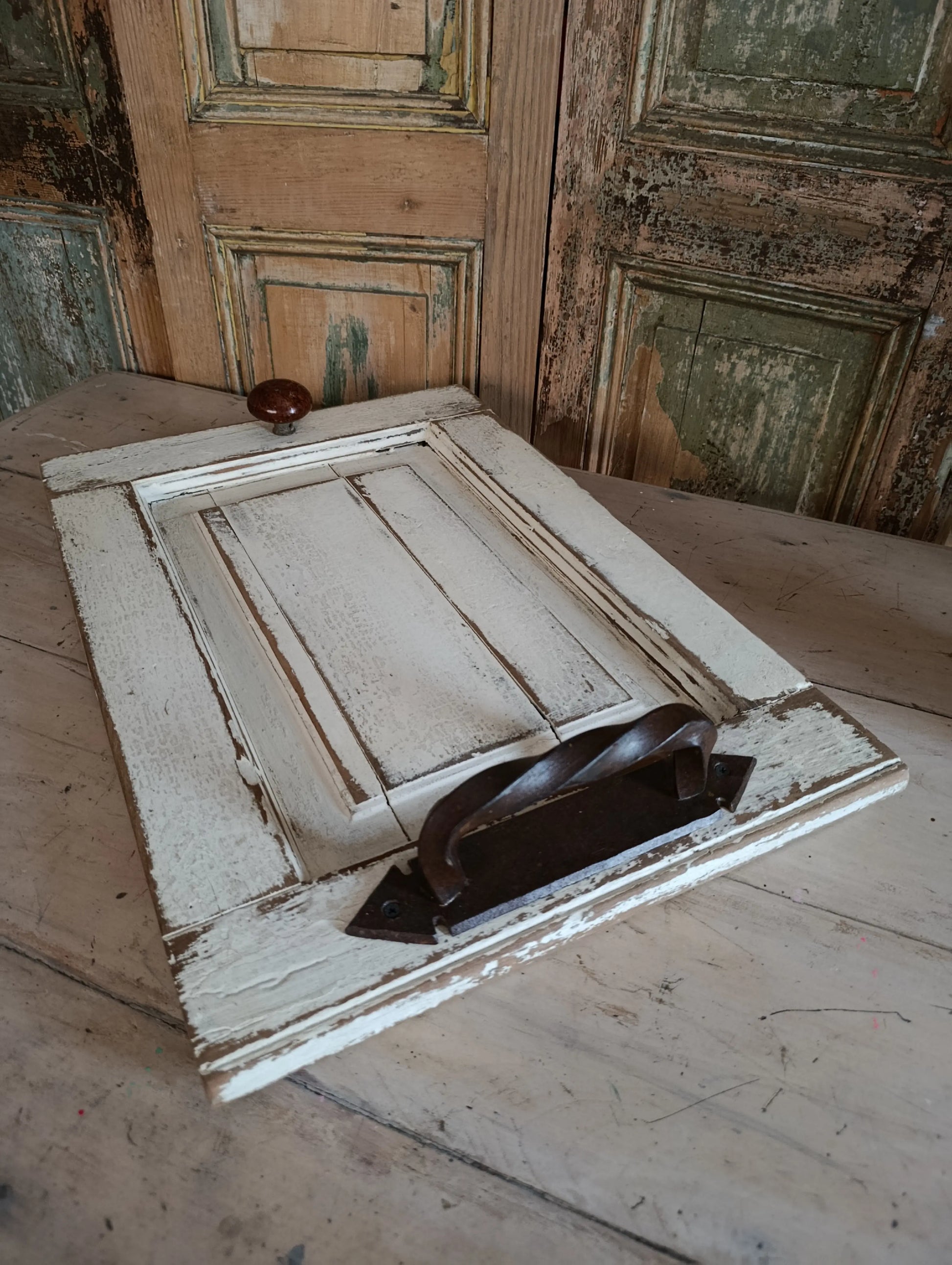 Bandeja decorativa y funcional, creada a partir de una antigua puerta de roble rescatada.