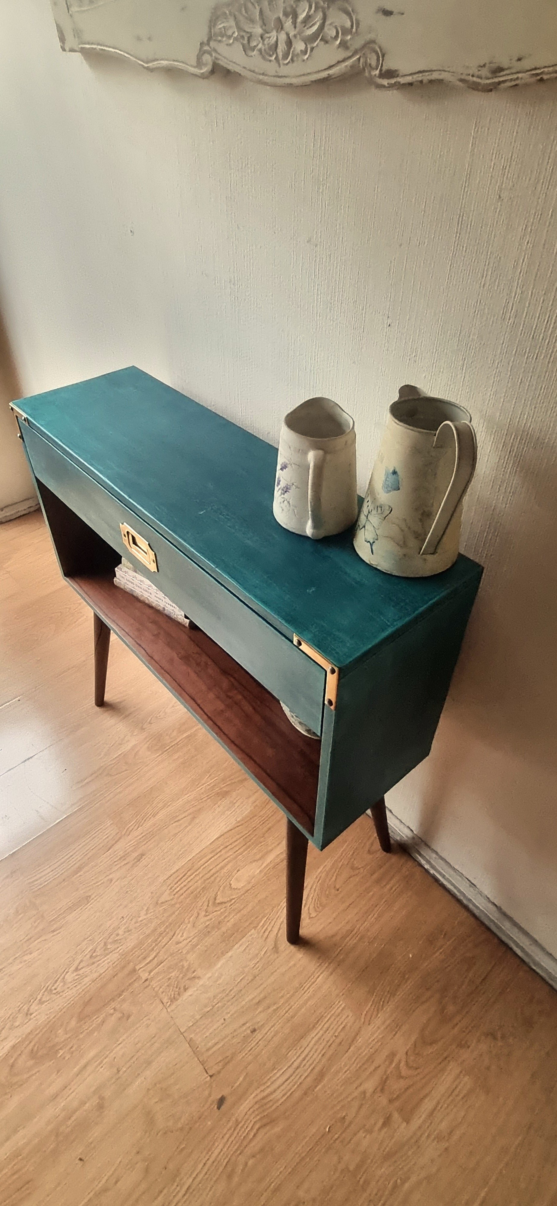 Con un vibrante color turquesa y detalles en madera natural, es perfecto para agregar un aire de sofisticación a cualquier espacio.