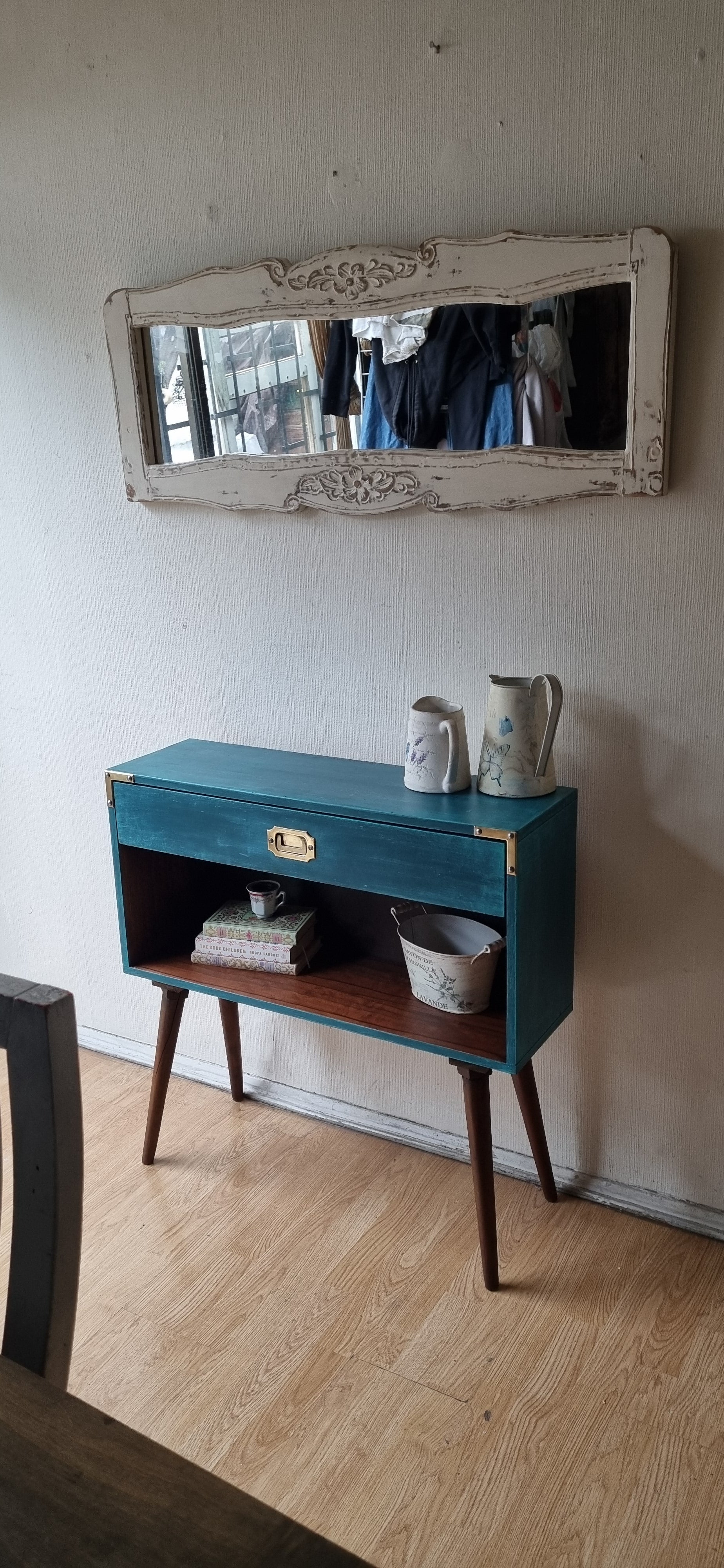 Las patas cónicas de madera le añaden un toque retro, mientras que el compartimento inferior abierto ofrece espacio para almacenamiento o exhibición. Sus medidas son 82 cm de ancho, 41 cm de fondo y 82 cm de alto.