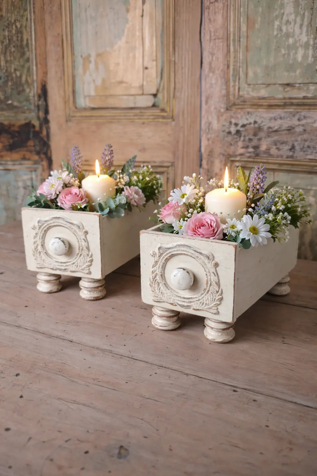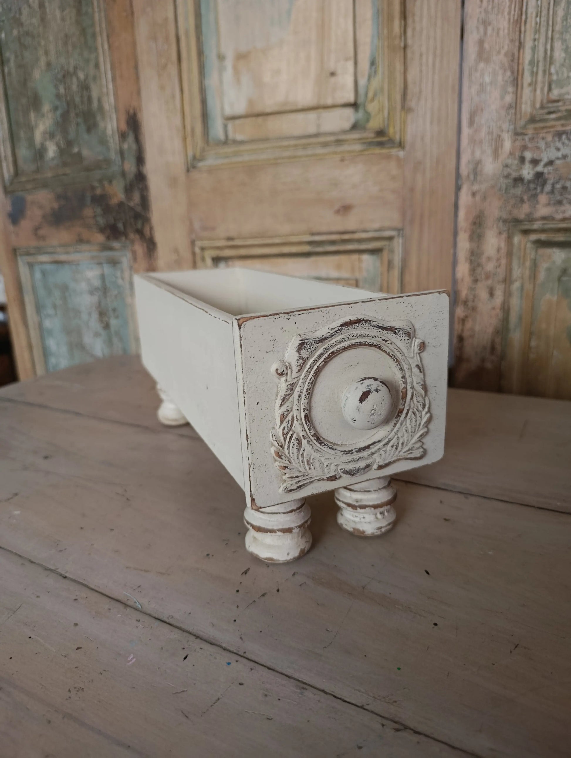 Cajitas decorativas hechas a partir de piezas originales de antiguas máquinas de coser Singer, restauradas y pintadas a mano en tonos claros con acabado envejecido.