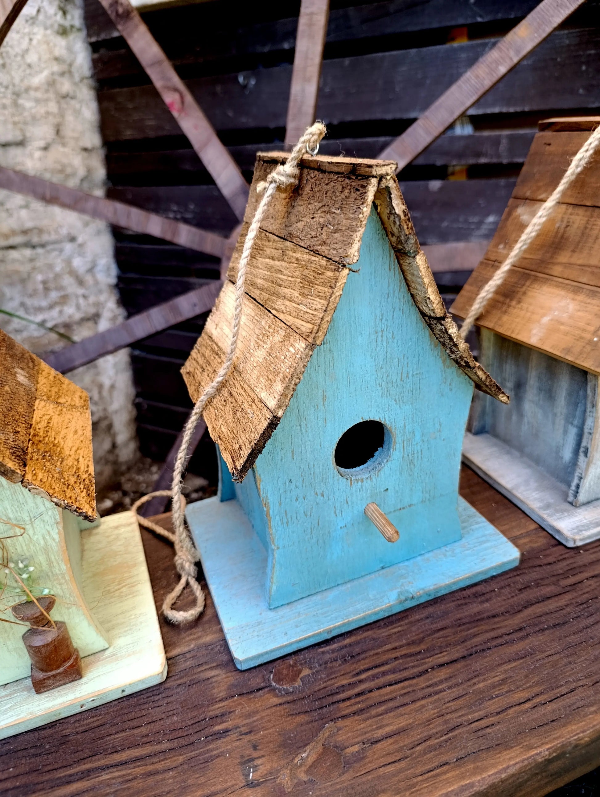 Hermosas casas de pájaros artesanales, perfectas para decorar tu jardín o patio. Disponibles con o sin decoración.