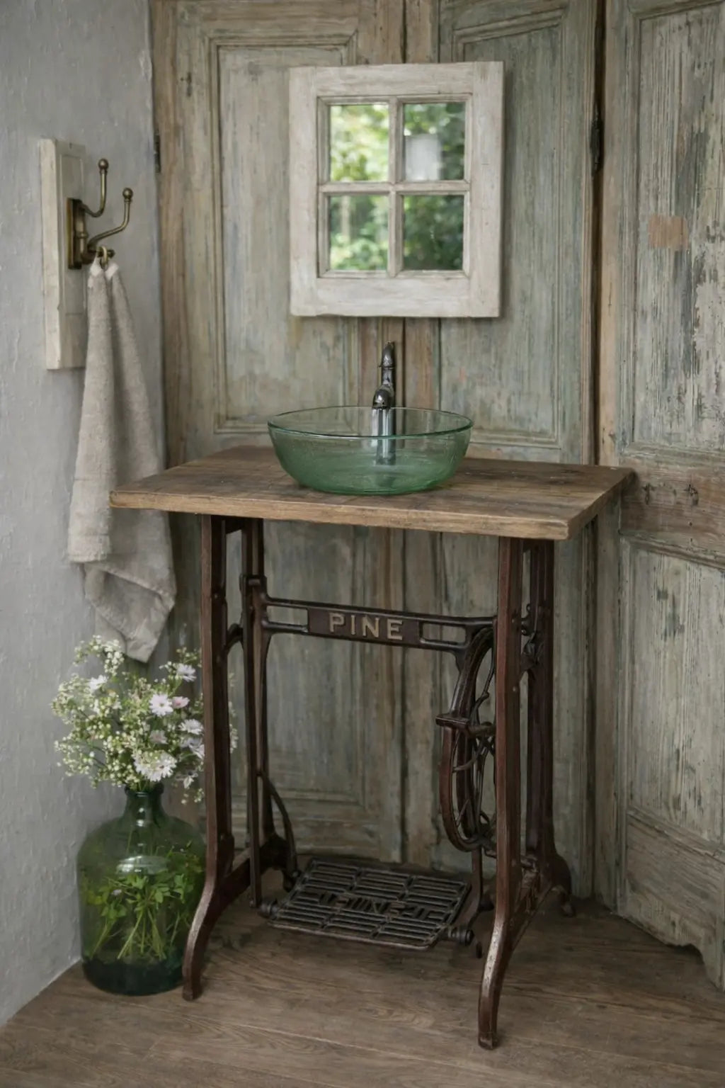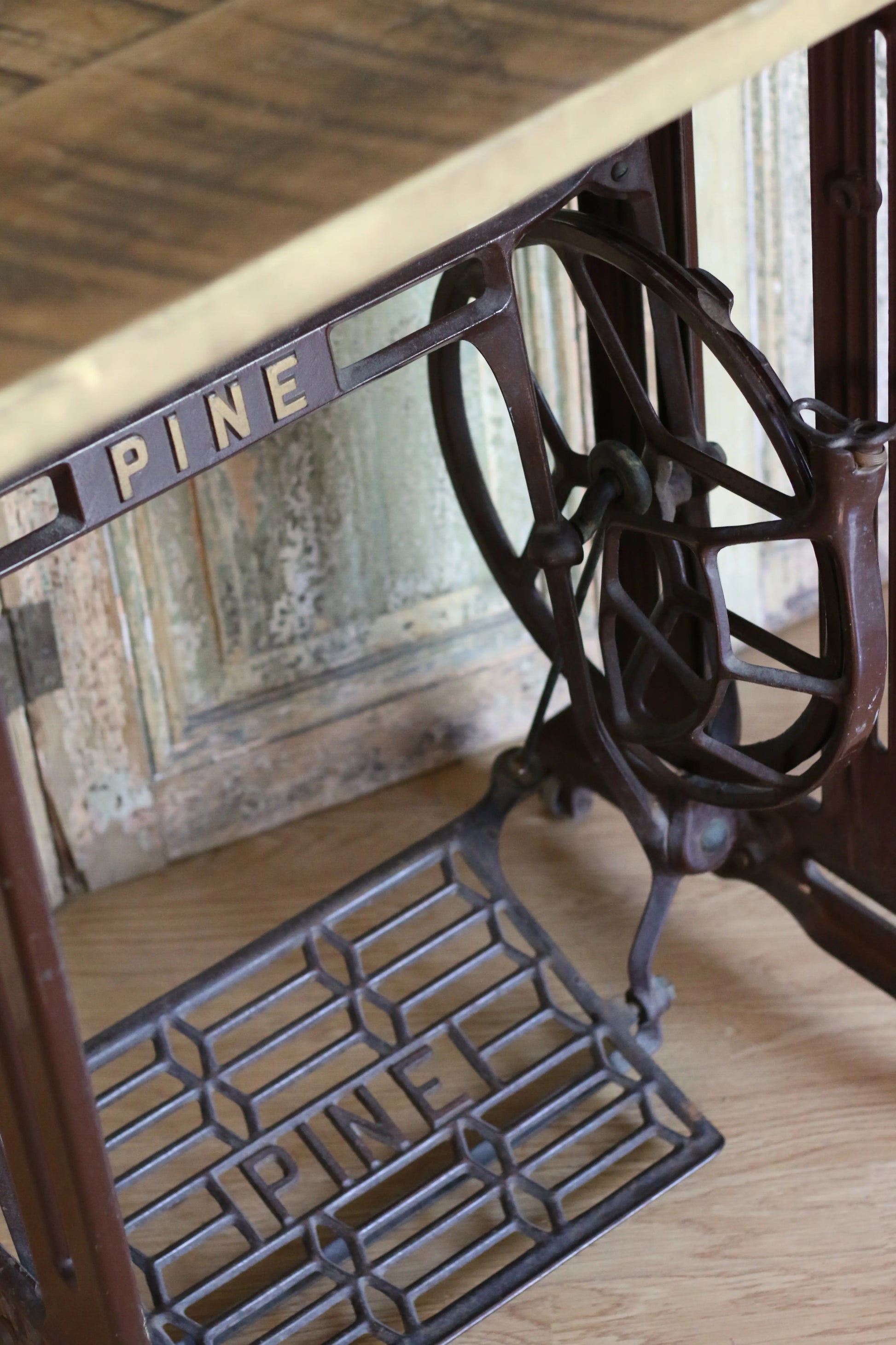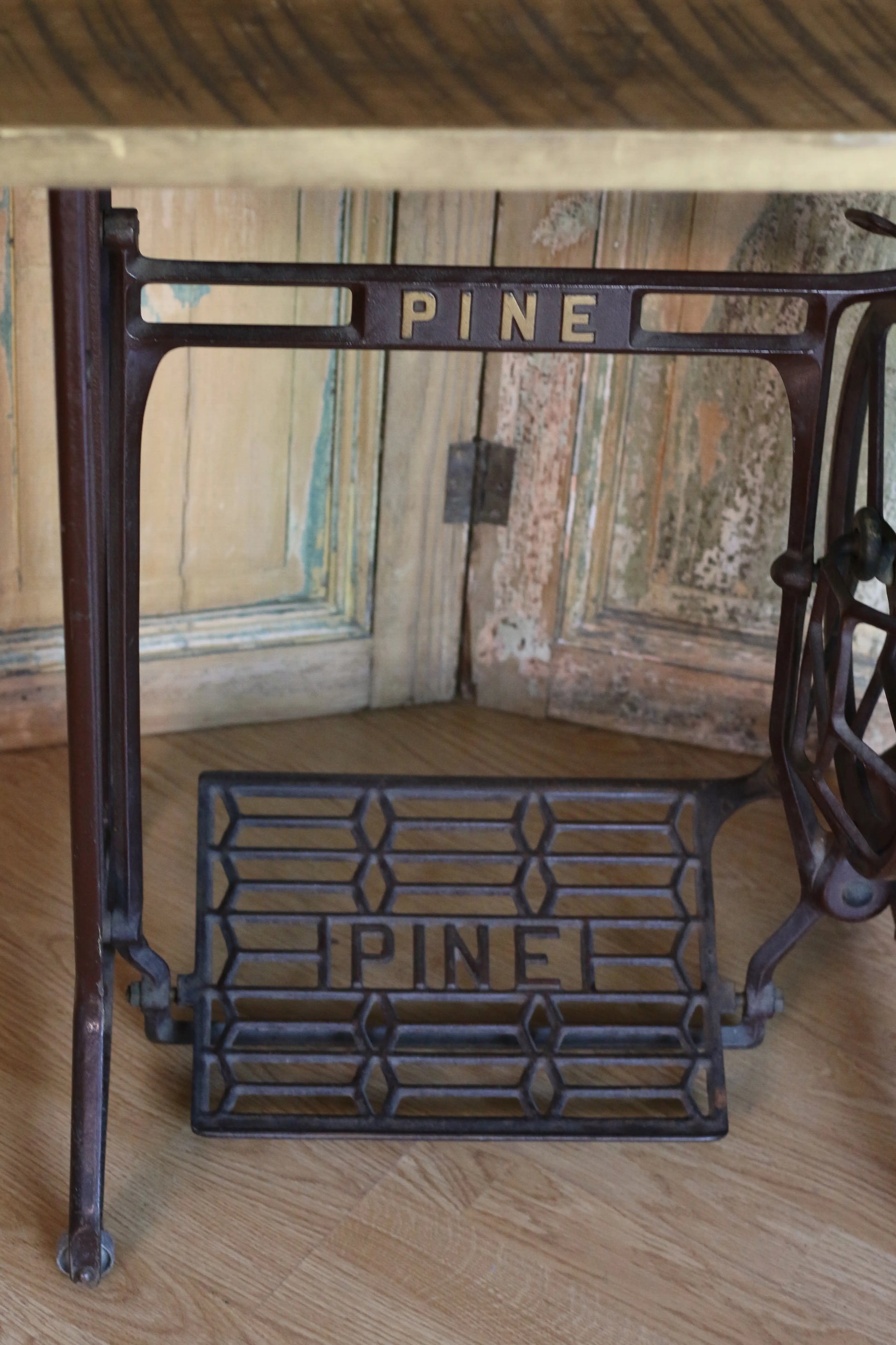 Hermoso mueble reutilizado con base de máquina de coser antigua marca Pine, tipo Singer. Una pieza única que combina historia y funcionalidad.