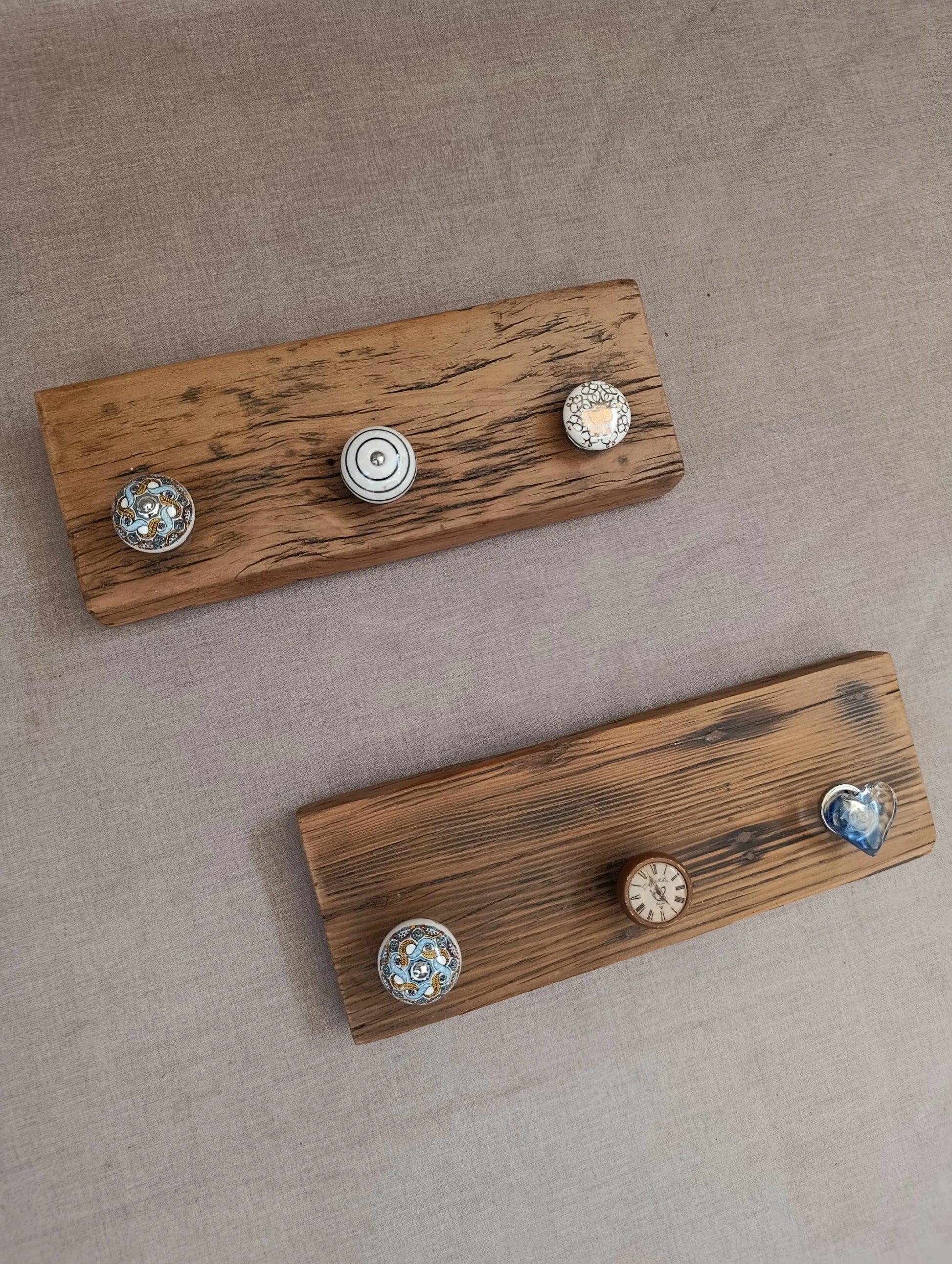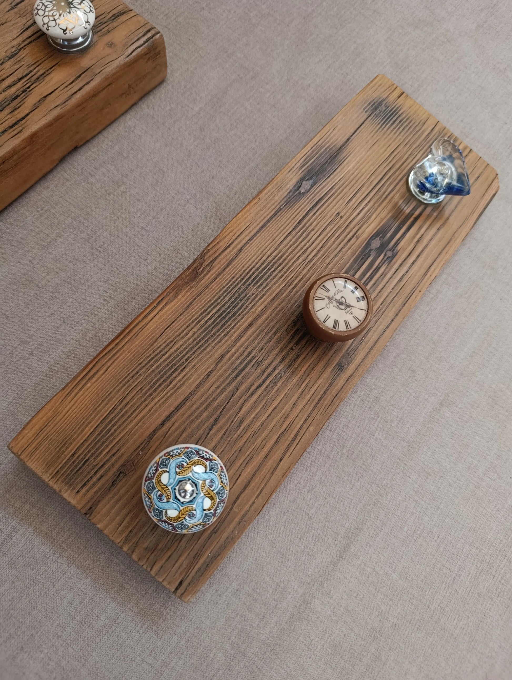 Este perchero rústico está hecho a mano con madera de demolición y perchitas de cerámica.
