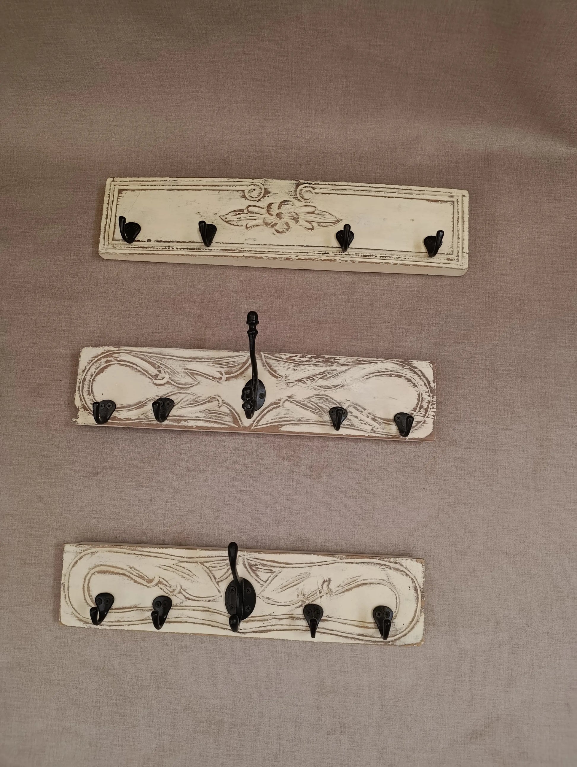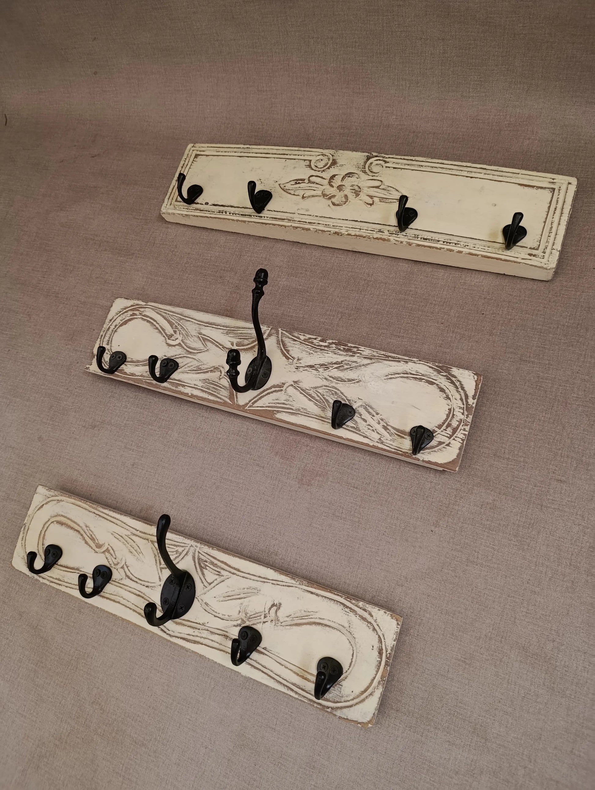 Esos percheros fueron creado a partir de una tapa de cajón antigua tallada, rescatada y transformada a mano para darle una nueva vida como pieza funcional y decorativa.