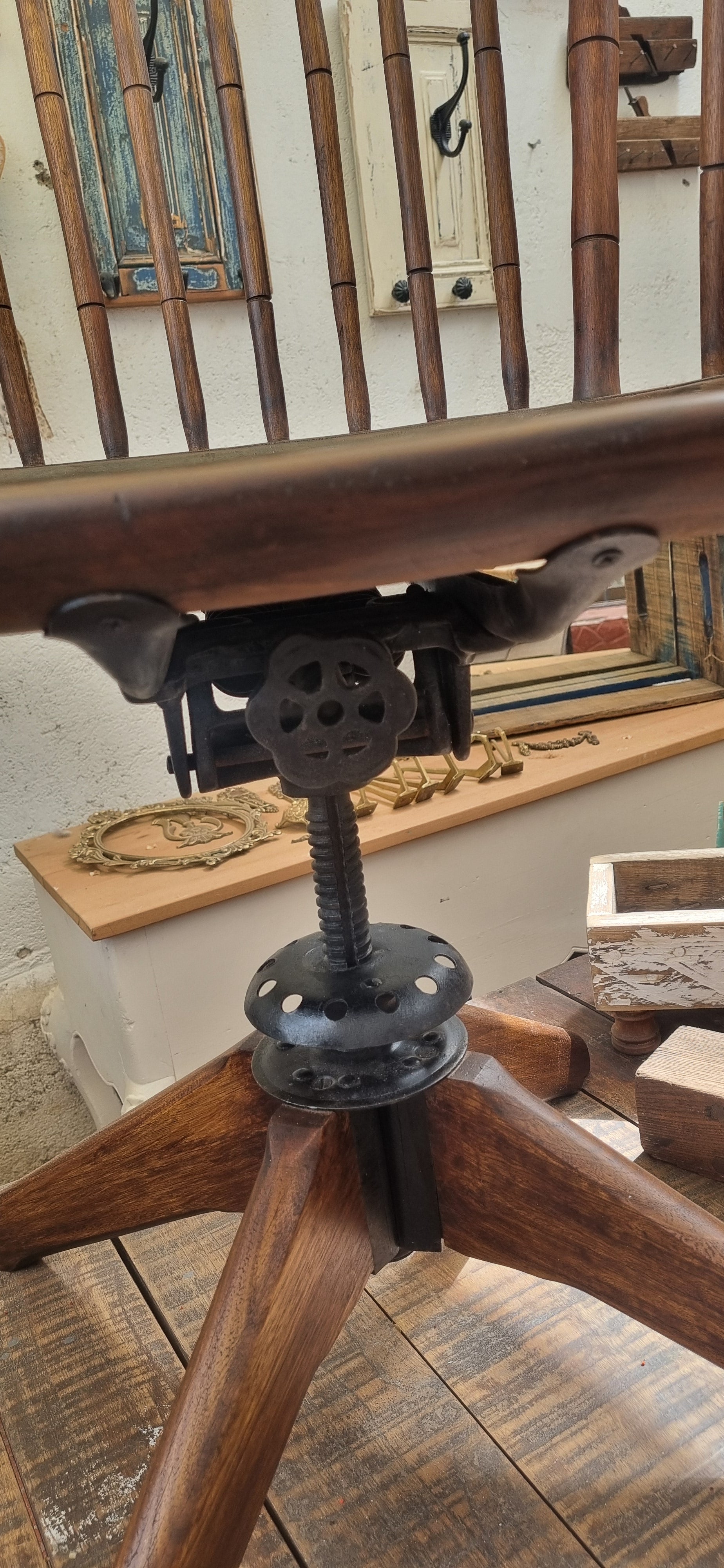 Con una base giratoria y reclinable, hecha a partir de patas recuperadas, y un asiento de madera reciclada, esta pieza única aporta estilo y comodidad a cualquier espacio.